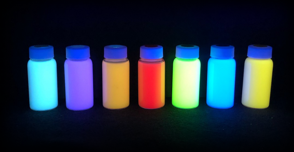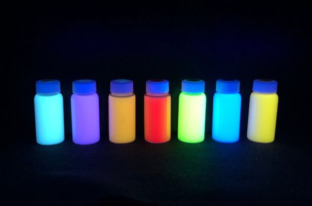 紫外線を投射すると7色に発光する、レインボービューシステムで用いられる調査液。